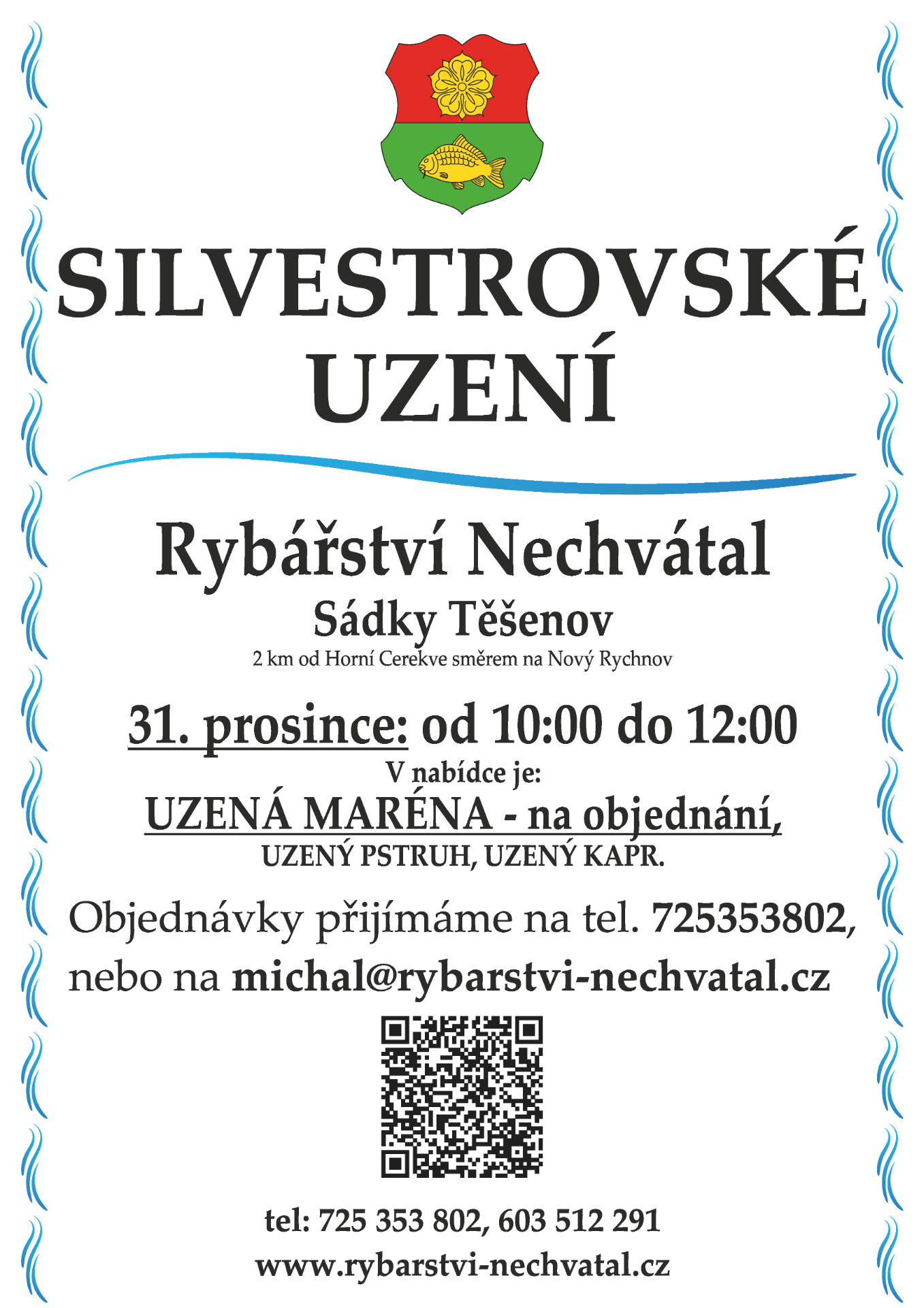 Přijeďte si k nám na sádky Těšenov pro čerstvé uzené ryby. Prodej bude probíhat 31.12.2025 od 10:00 do 12:00. Budeme udit KAPRA, PSTRUHA, MARÉNU